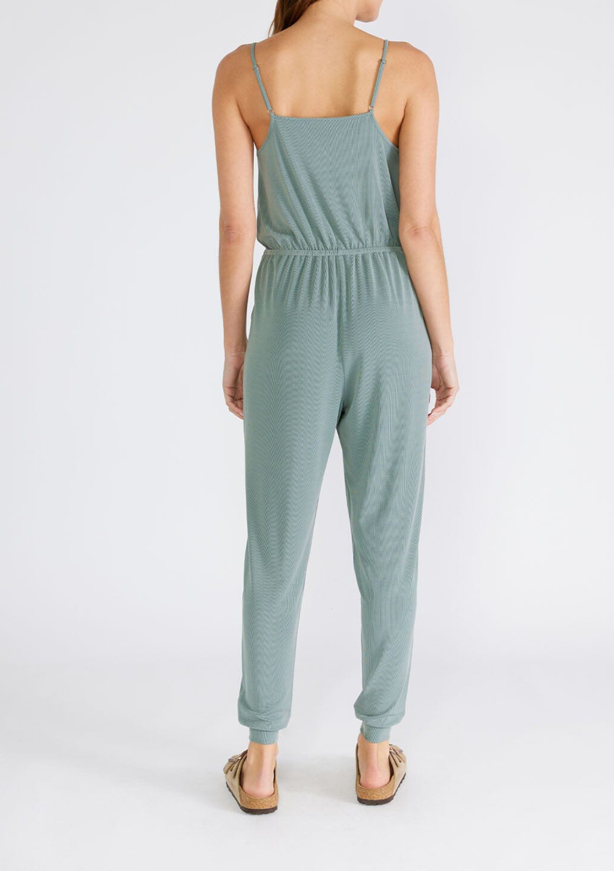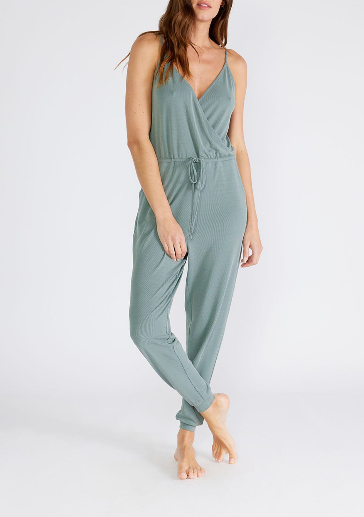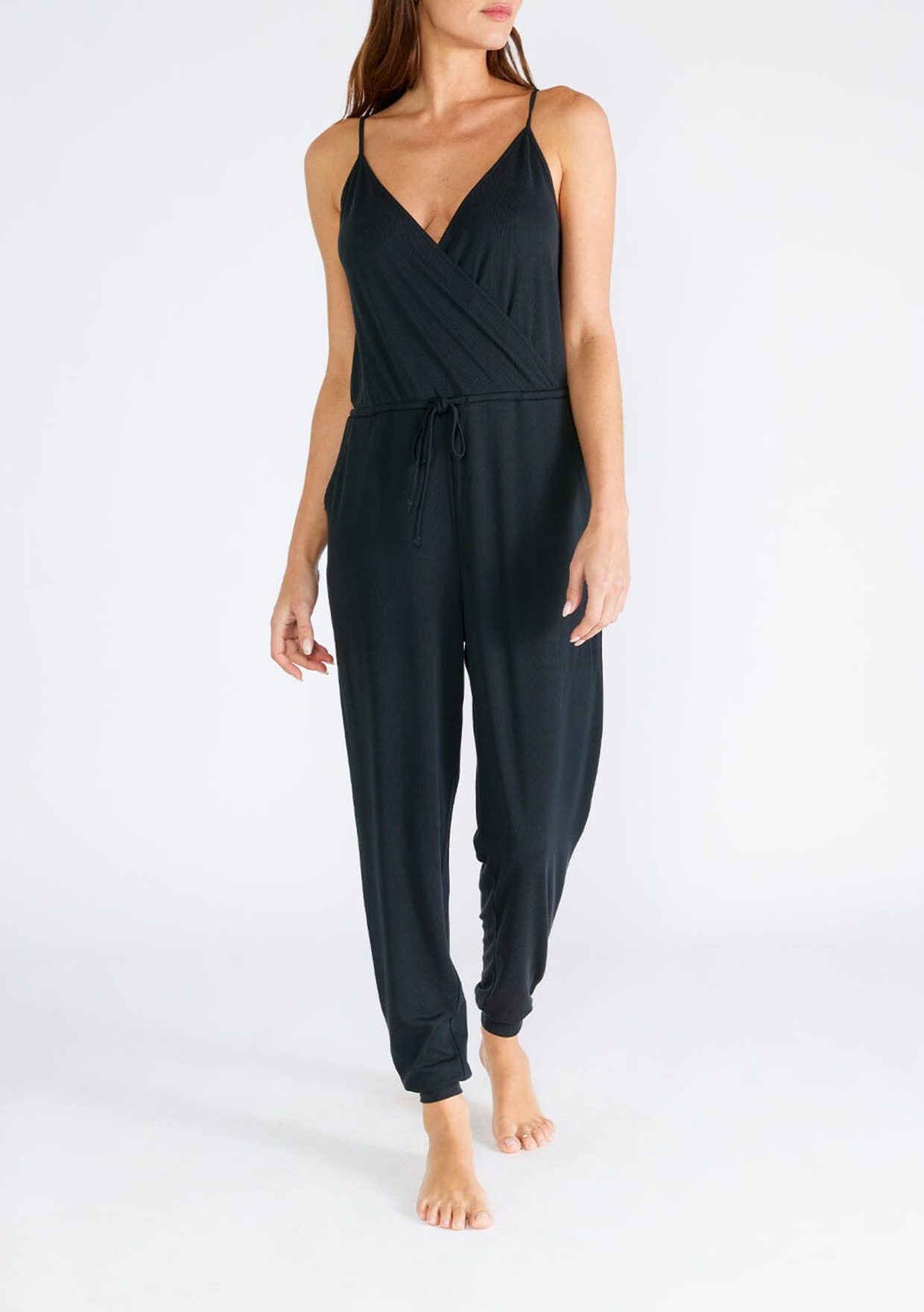 For the studio or lounging at home, our soft and stretchy ribbed knit jumpsuit is designed to fit your day. With adjustable spaghetti straps, a sexy surplice v-neckline, and an adjustable