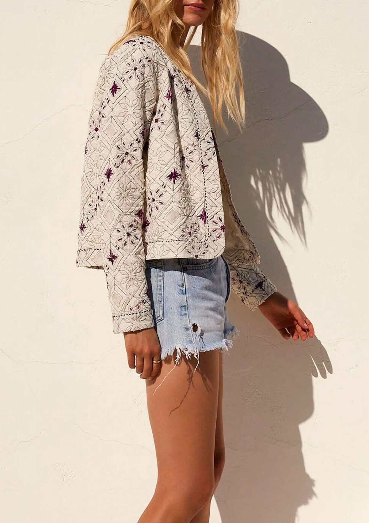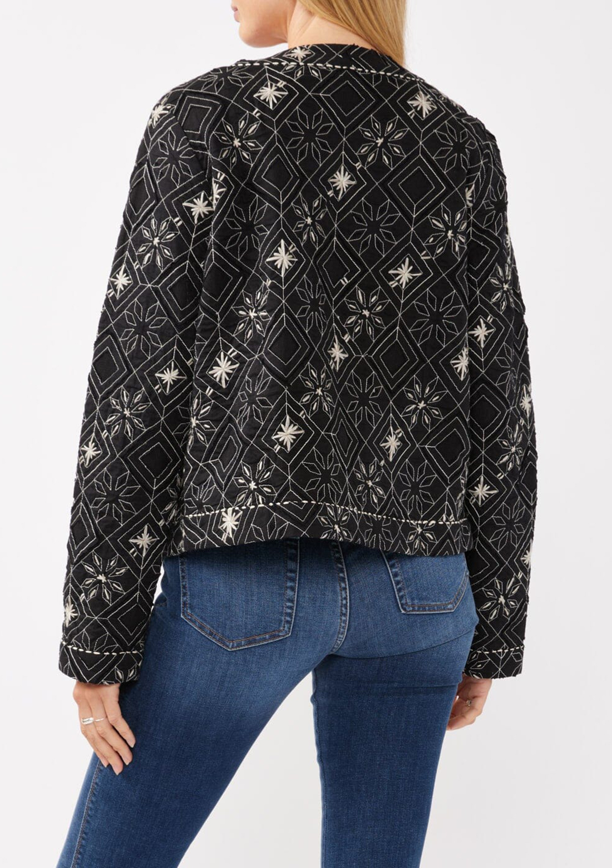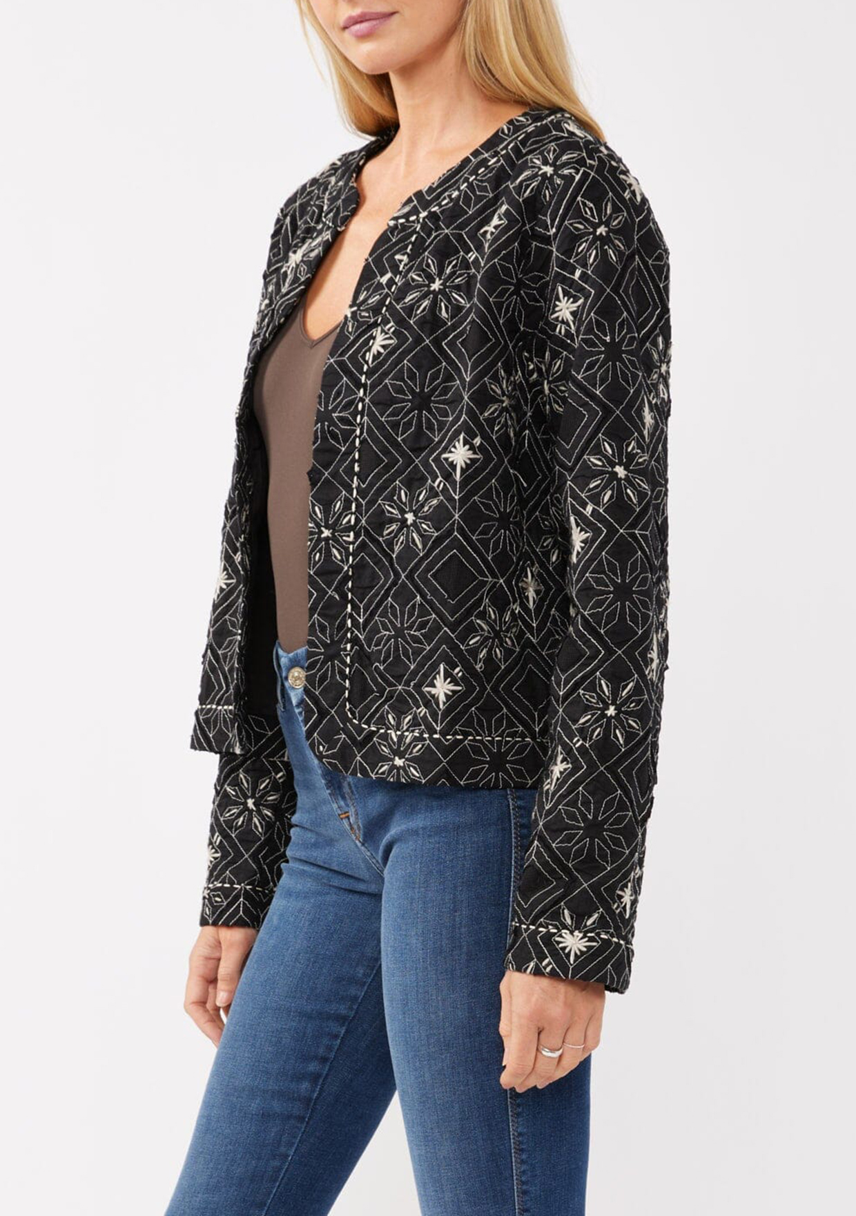 A stunning statement jacket for spring. Our unique bohemian lady jacket is the perfect light layer for transitional weather, and features a cropped silhouette and contrast embroidered detail
