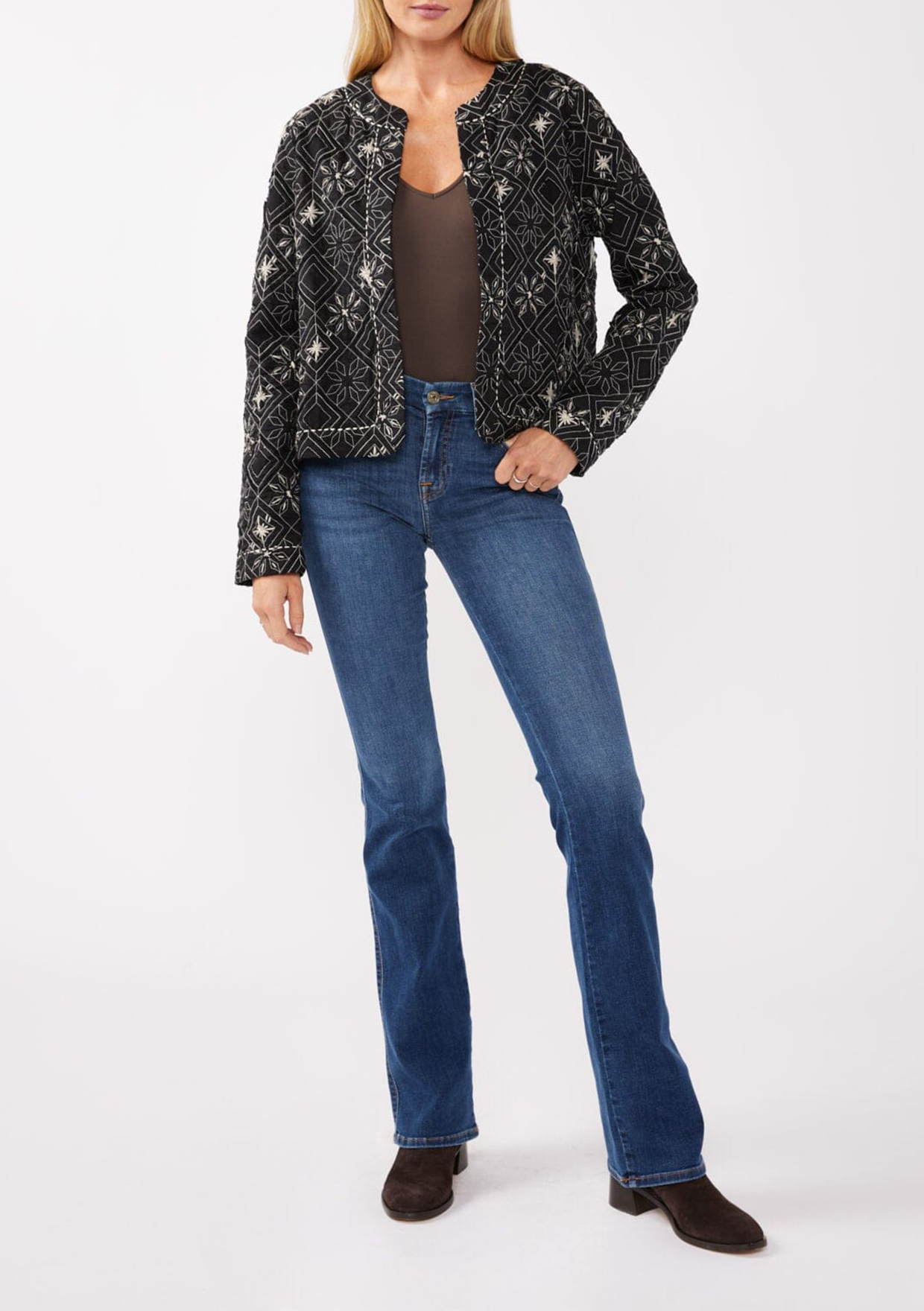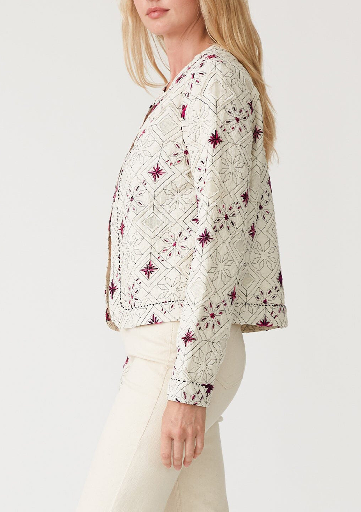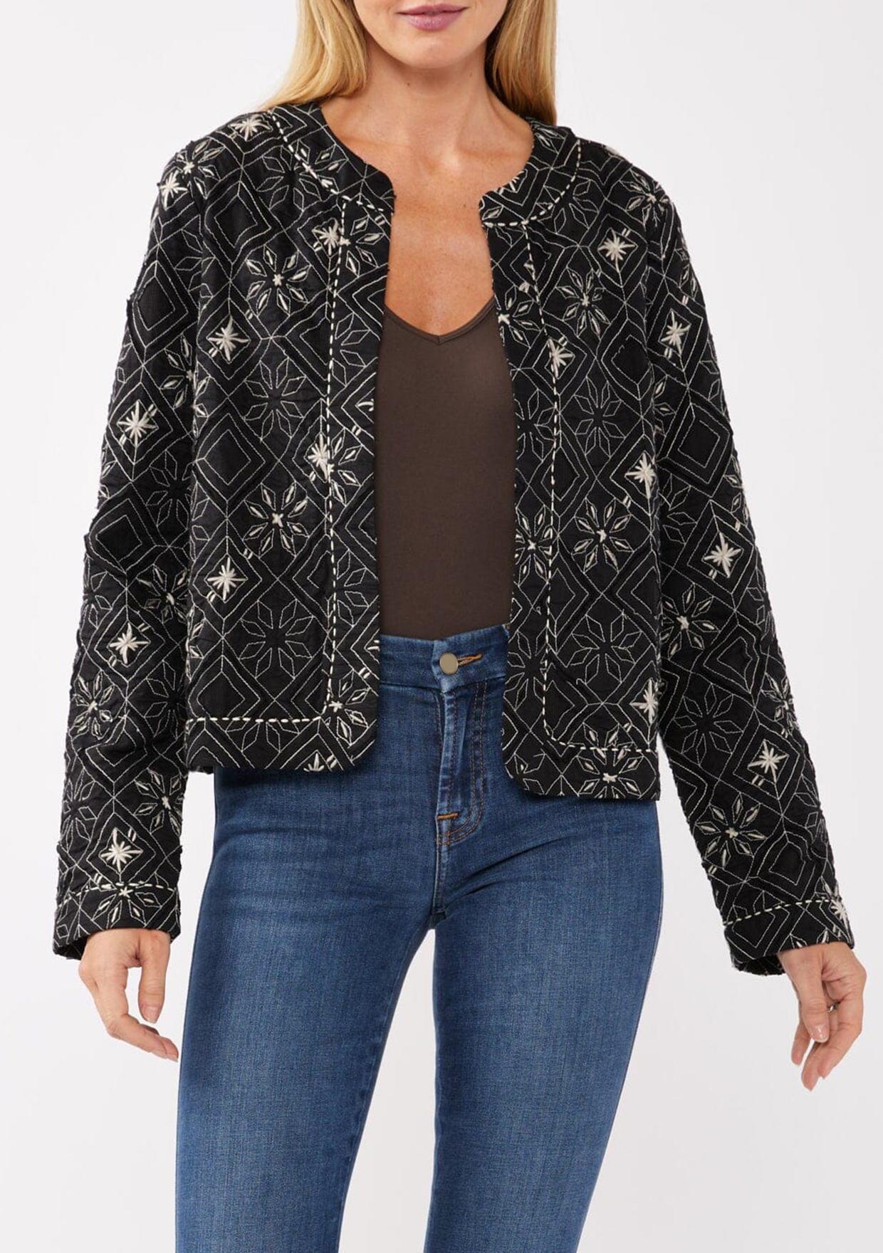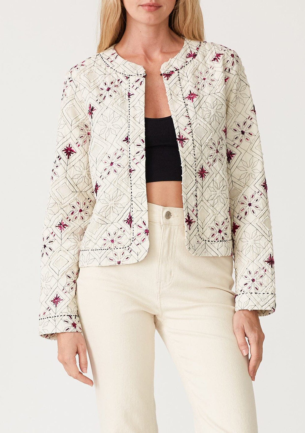 A stunning statement jacket for spring. Our unique bohemian lady jacket is the perfect light layer for transitional weather, and features a cropped silhouette and contrast embroidered detail