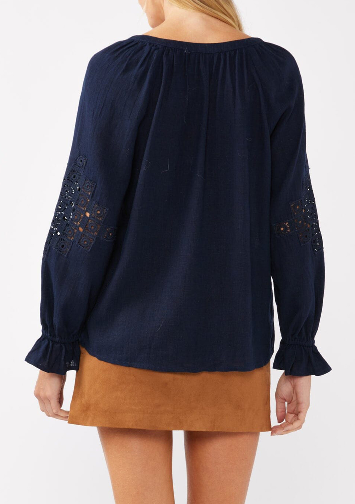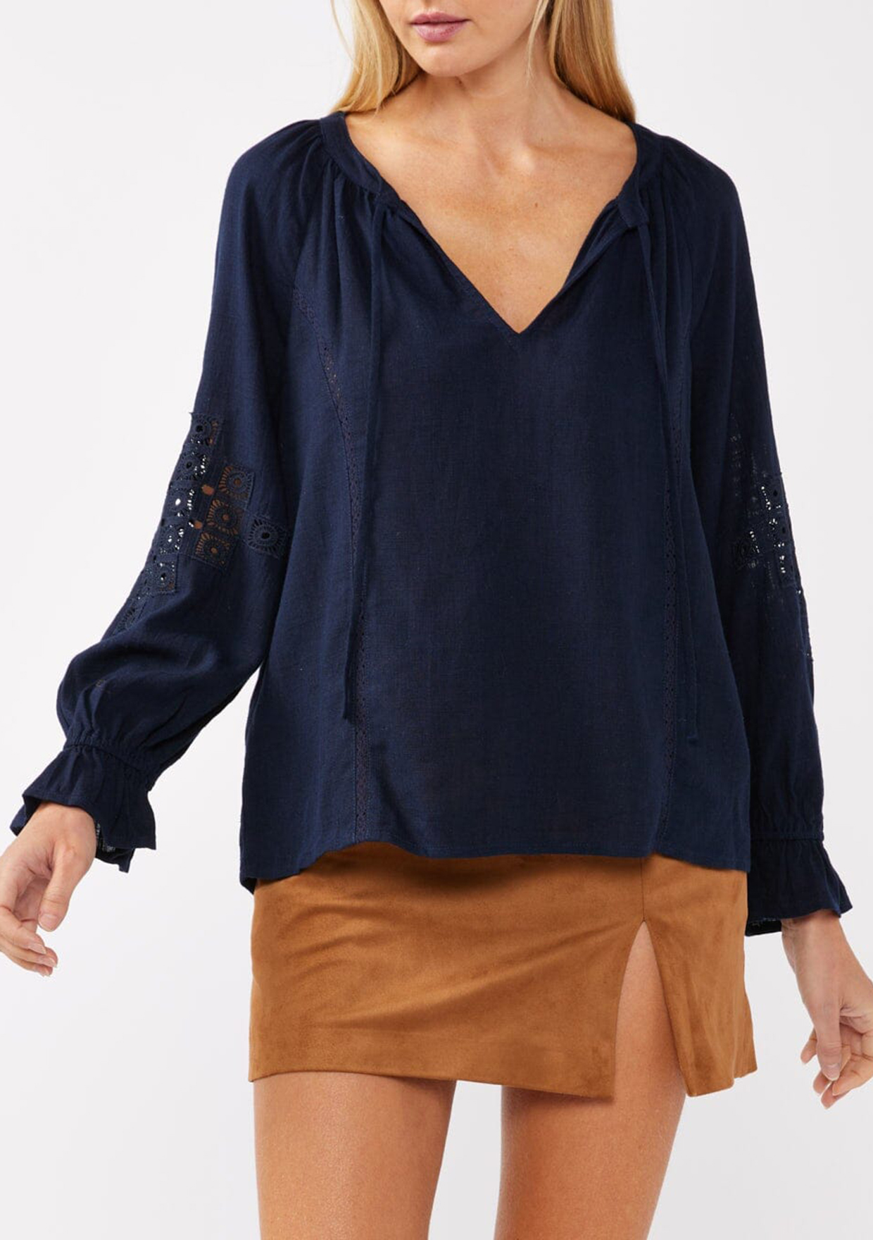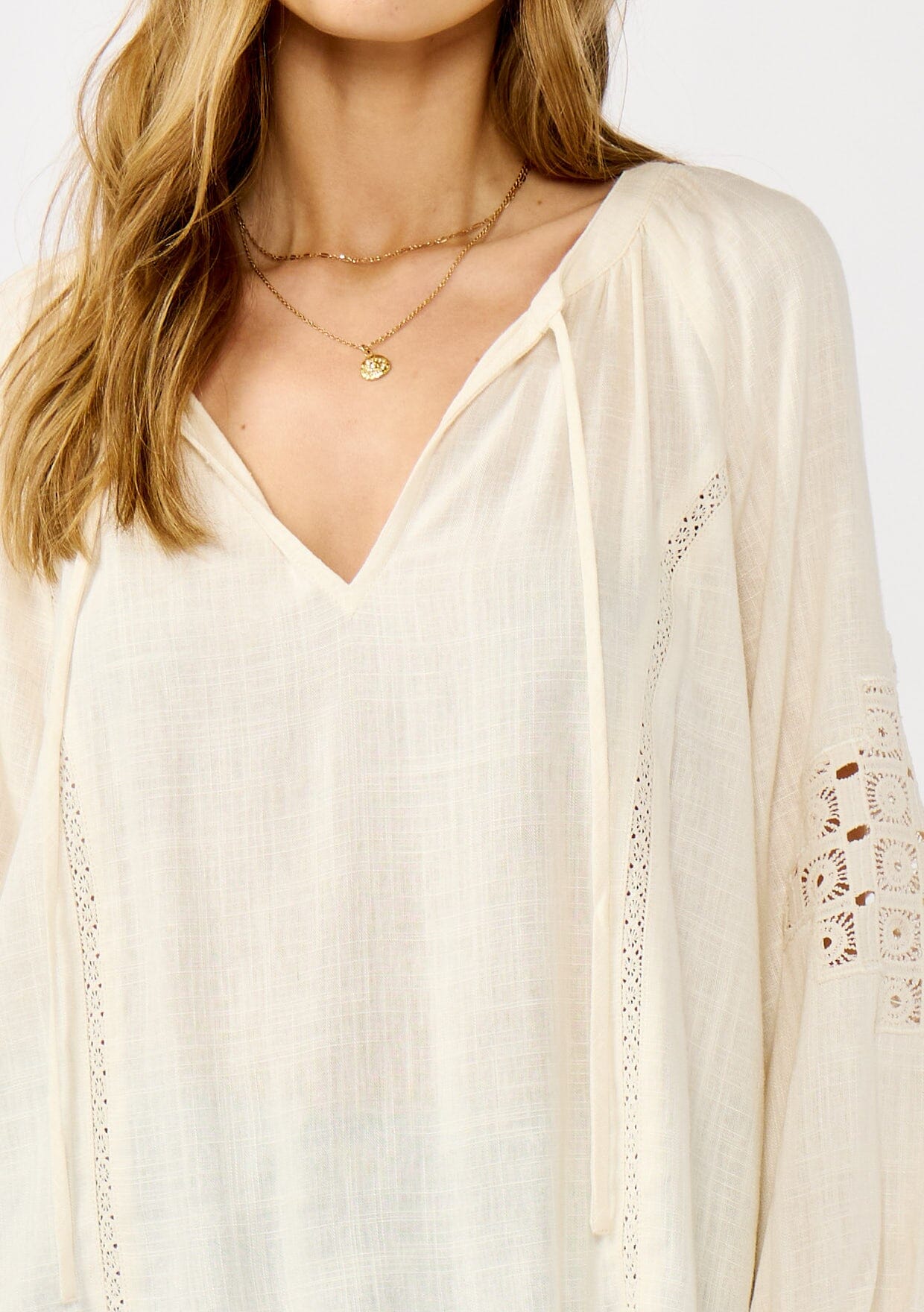 eet your new boho favorite—our ultra-flowy peasant blouse, crafted from a dreamy rayon and linen blend for a cool, breathable feel. Featuring long sleeves with pretty embroidered lace details, ruffled elastic cuffs, and a split v-neckline with ties. Tuck it into your favorite denim for an effortless boho ensemble that feels as timeless as it looks.