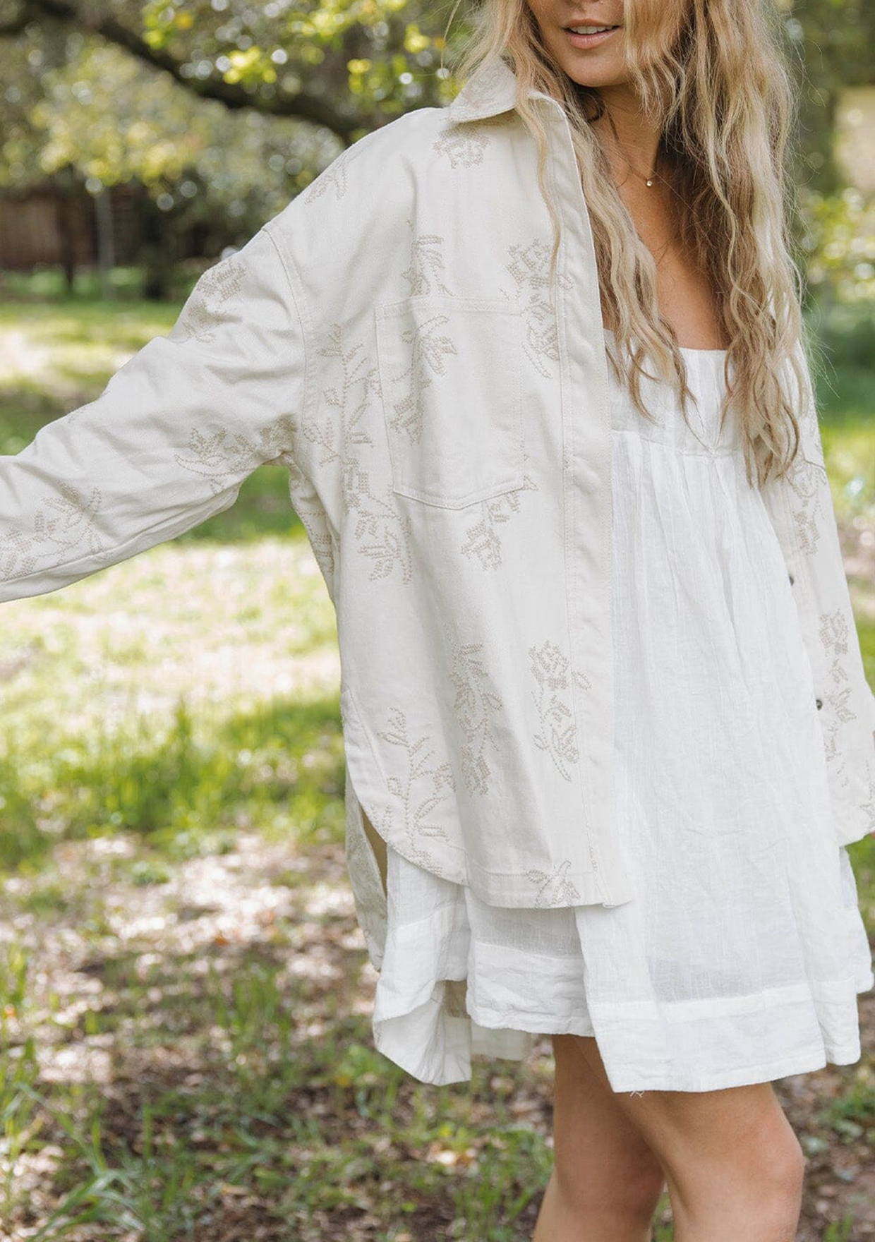Delicate embroidered floral details add a bohemian touch to this cool, lightweight spring shirt jacket. With long sleeves, a classic collared neckline, and a snap button front. The perfectly