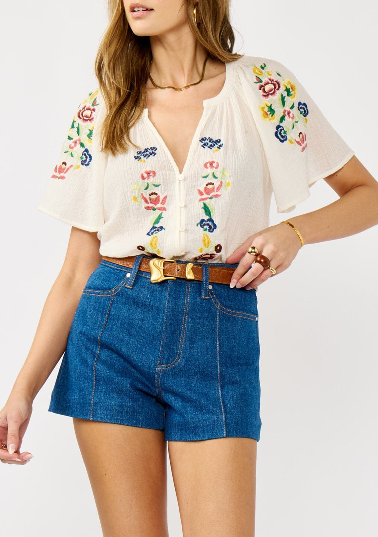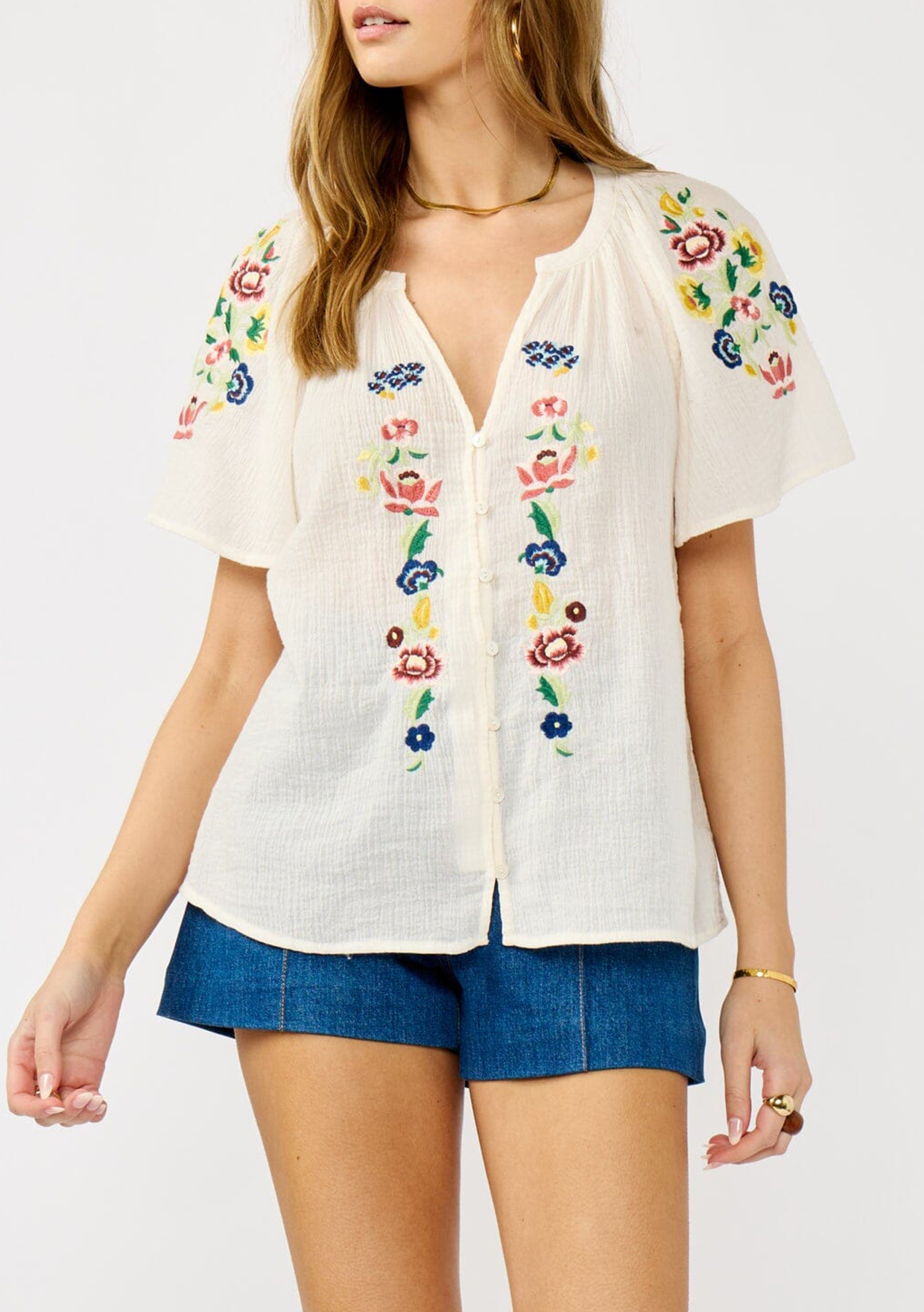 Embrace the sun in this effortlessly chic boho top, perfect for carefree days. Made from soft, breezy cotton gauze, it features intricate contrast embroidery and a playful split v-neckline
