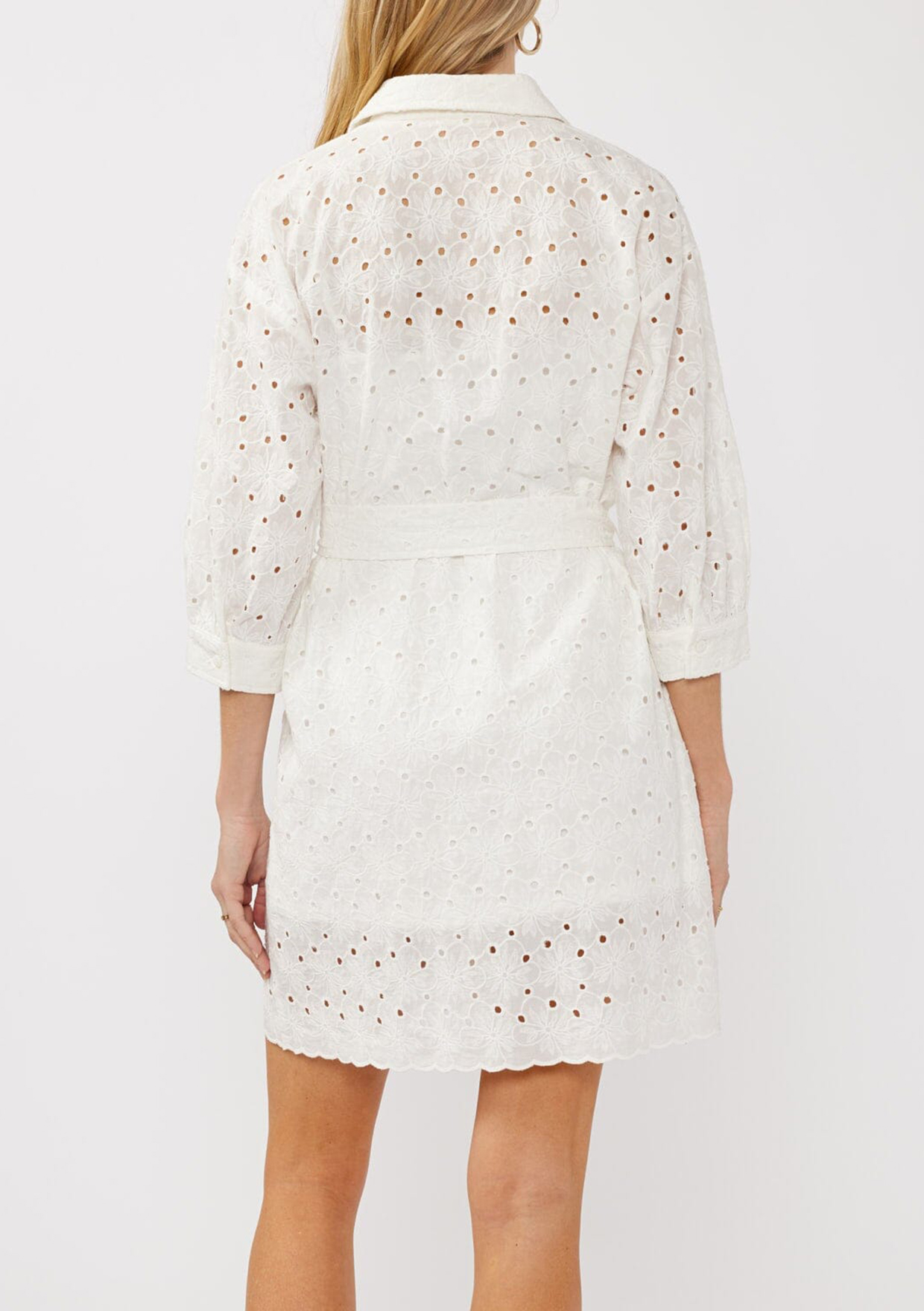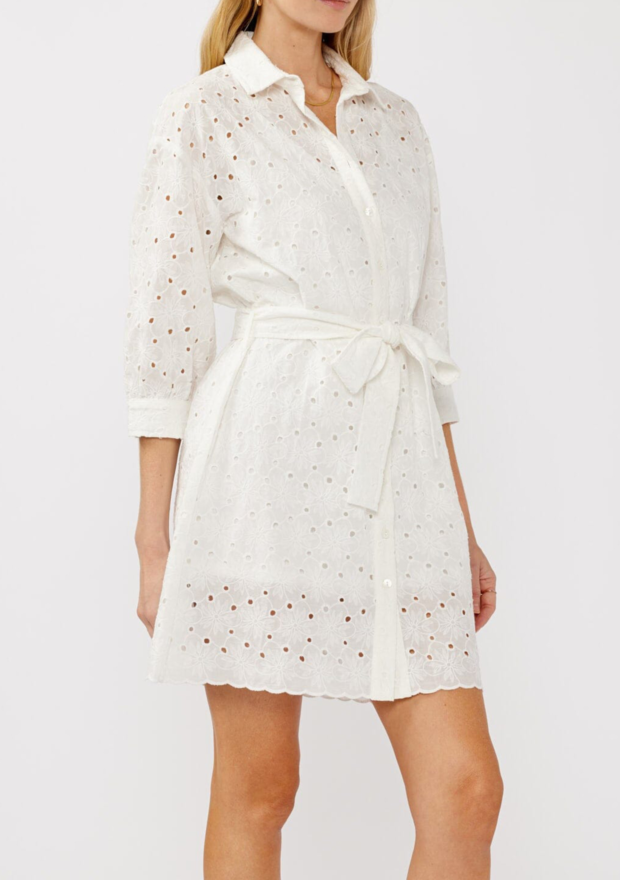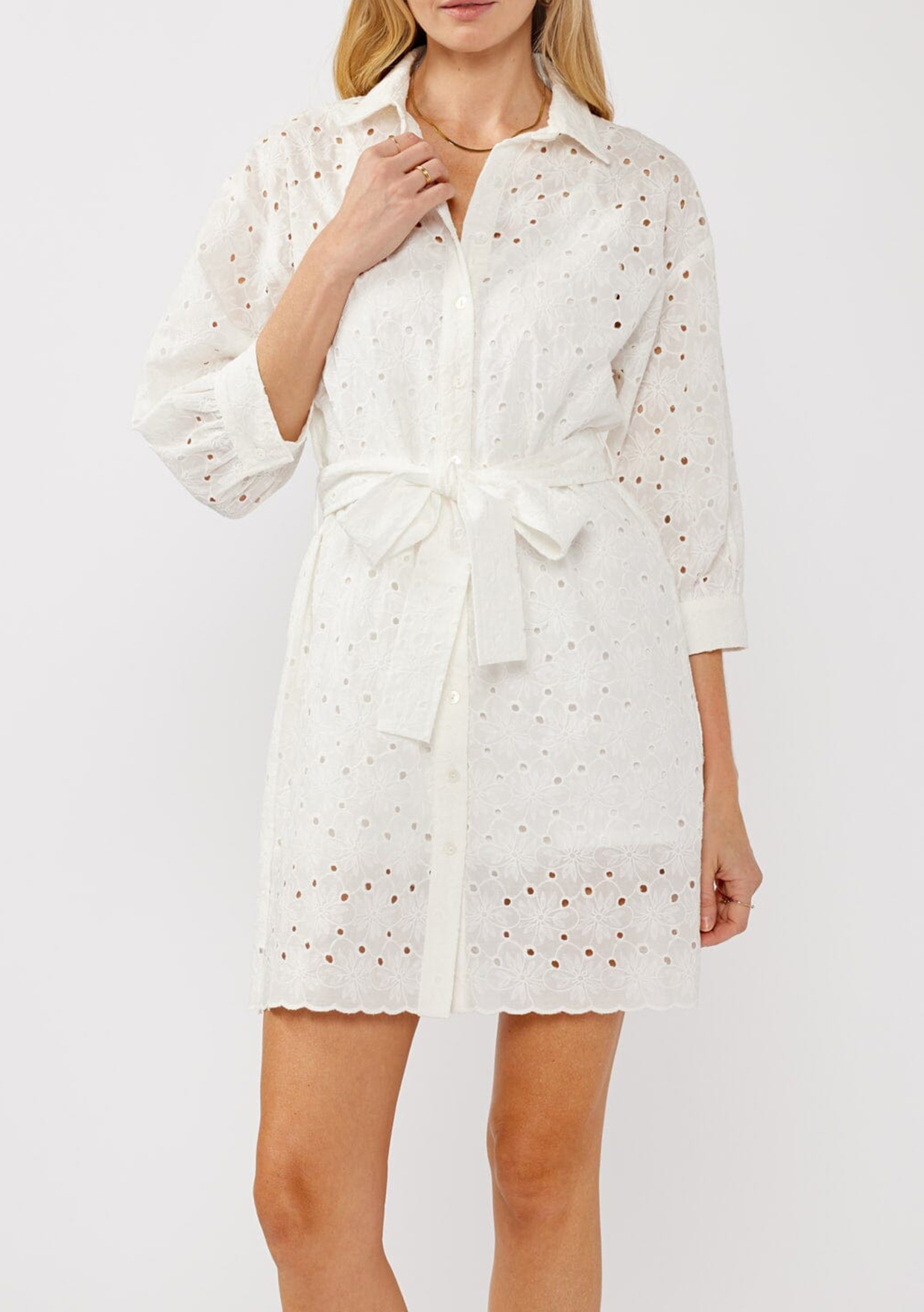 Step into effortless style with this bohemian spring mini shirt dress, designed with feminine flair. The delicate eyelet details and button front add a subtle sophistication, while the tie