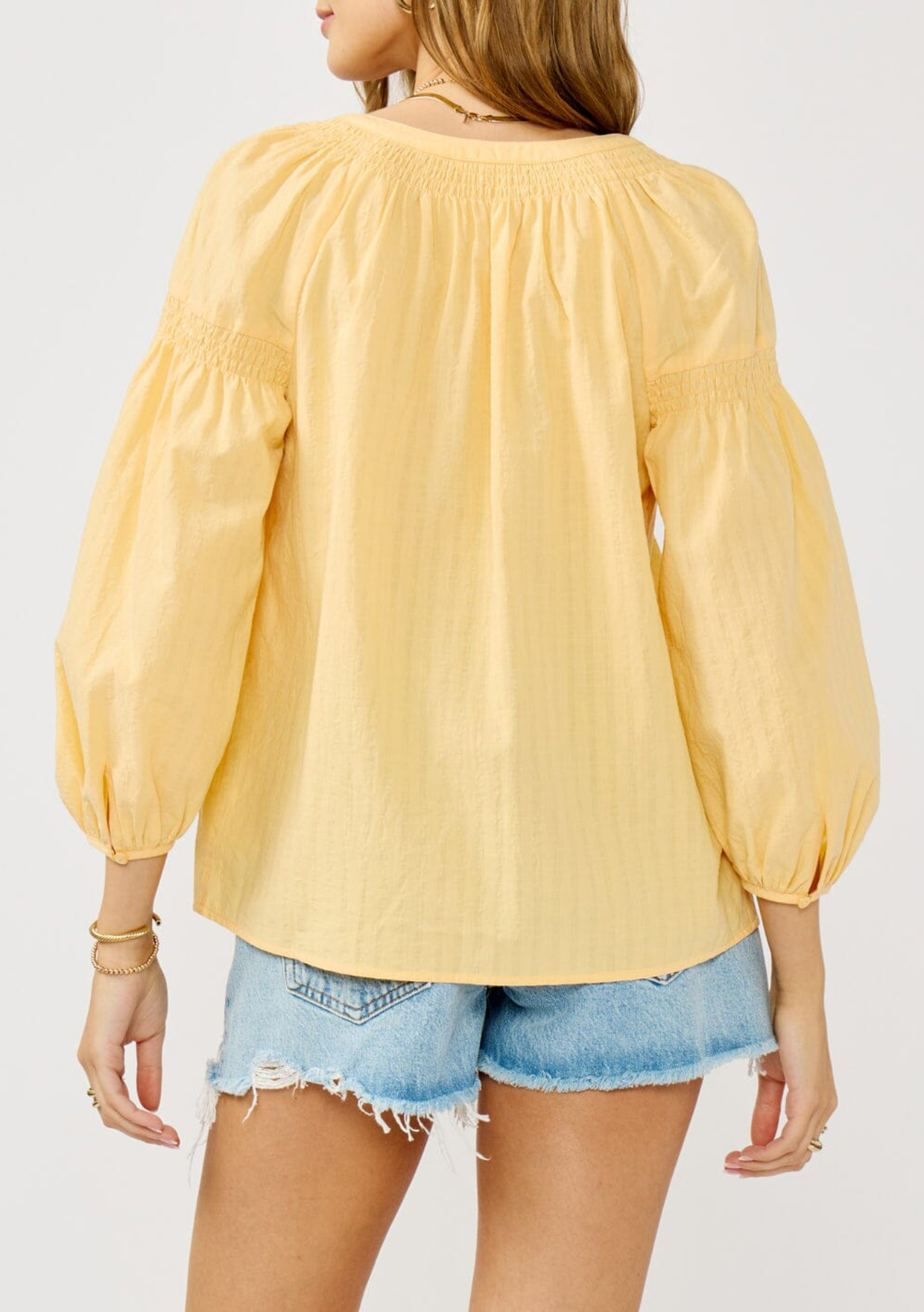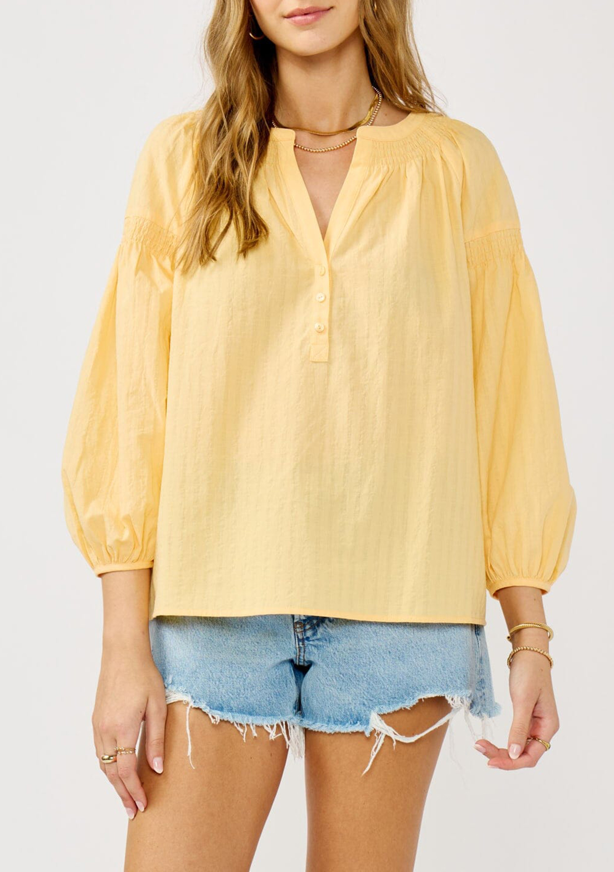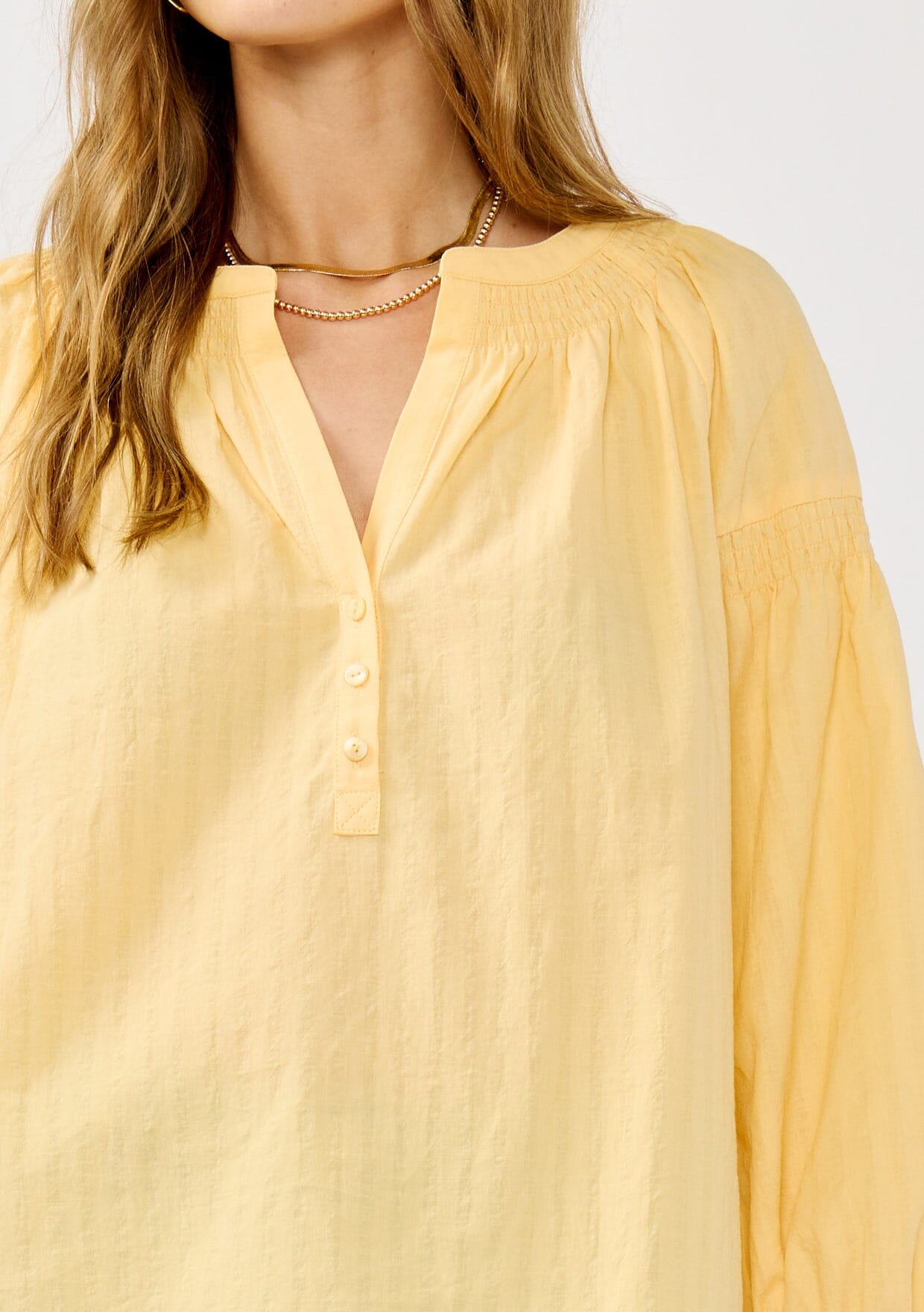 This effortless boho blouse was made for warm weather days and easy styling. Designed with a breezy fit, split v-neckline, button front, and delicate smocked details, it brings a relaxed charm to any look. Pairs perfectly with classic denim for a cool, comfortable outfit you can wear all season long.