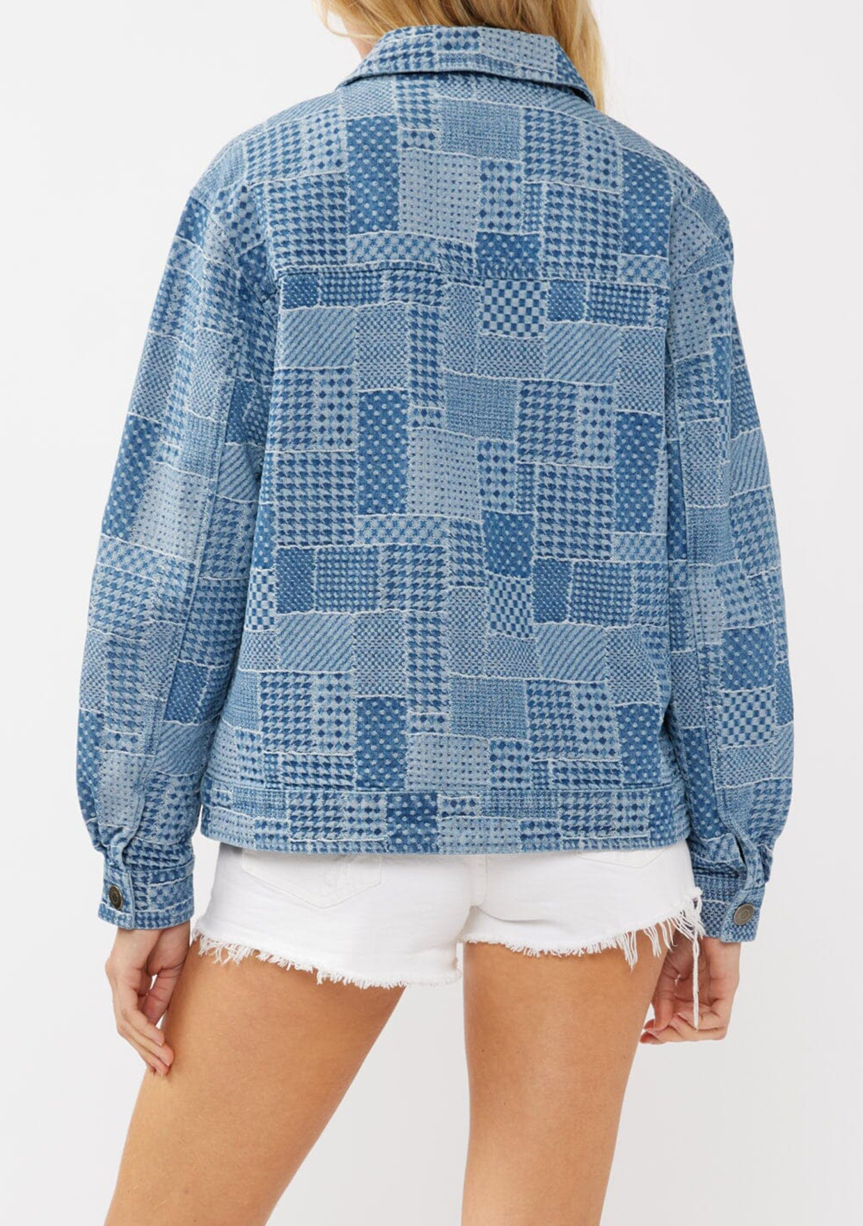 A one-of-a-kind patchwork jacket! Made from a perfect blend of mixed patchwork and a playful checkered design. Featuring a collared neckline, industrial-style tack buttons, and practical