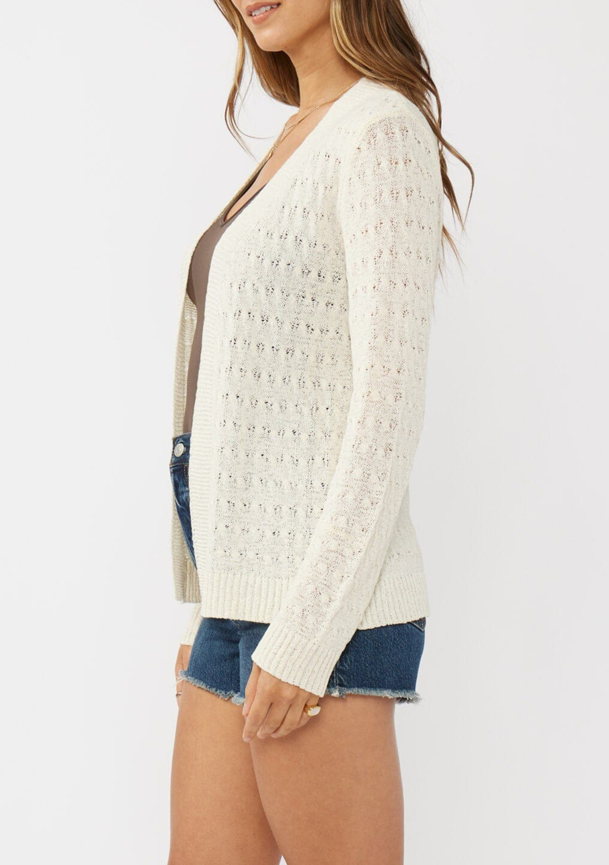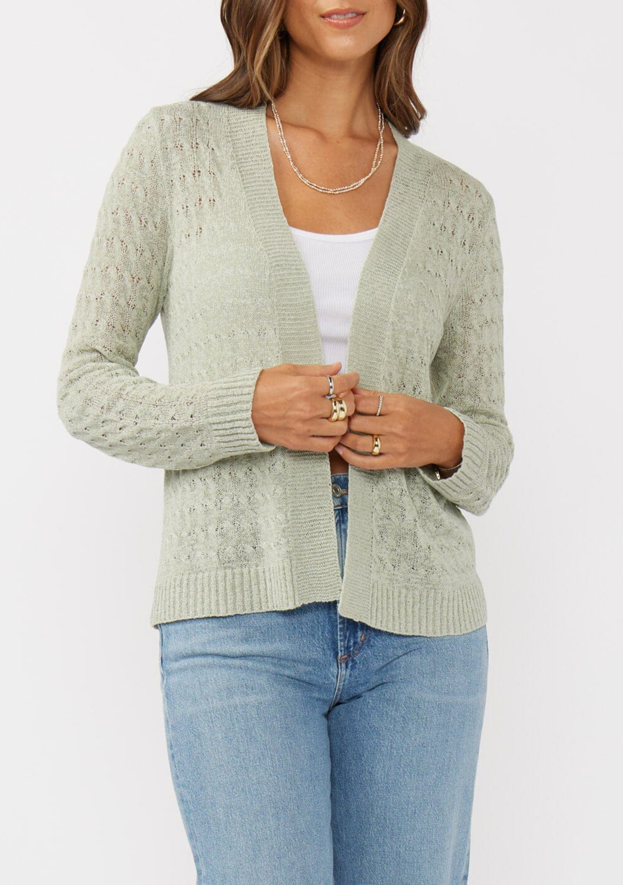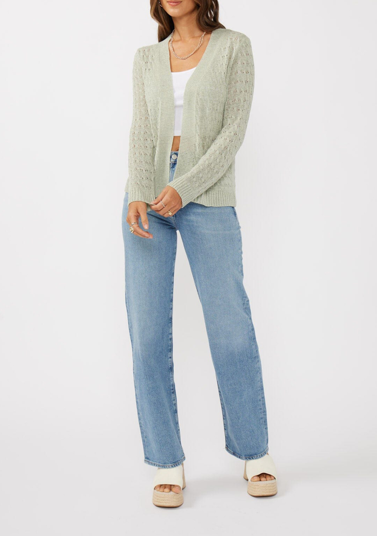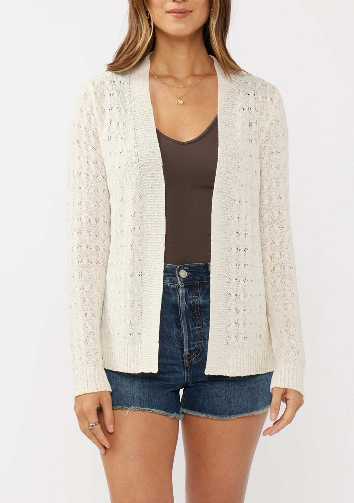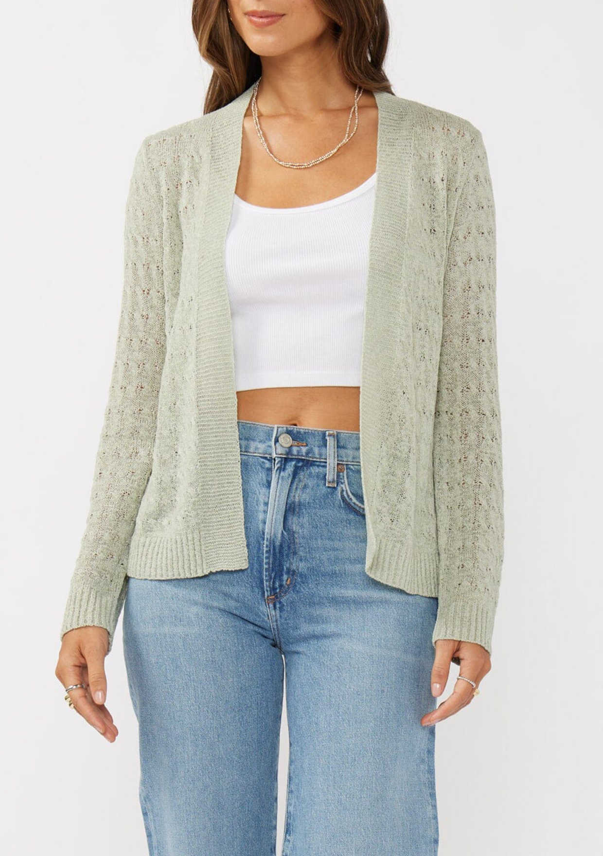 Elevate your spring wardrobe with this must-have tape yarn cardigan! Effortlessly throw it over a simple cami for an instant upgrade to your casual look. Its lightweight feel makes it the