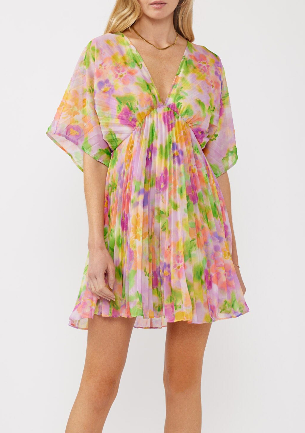 Embrace the vibrant beauty of spring in this effortlessly flowy mini dress. Designed with an artistic floral print, it features breezy dolman sleeves, a deep v-neckline, and a chic tie-back