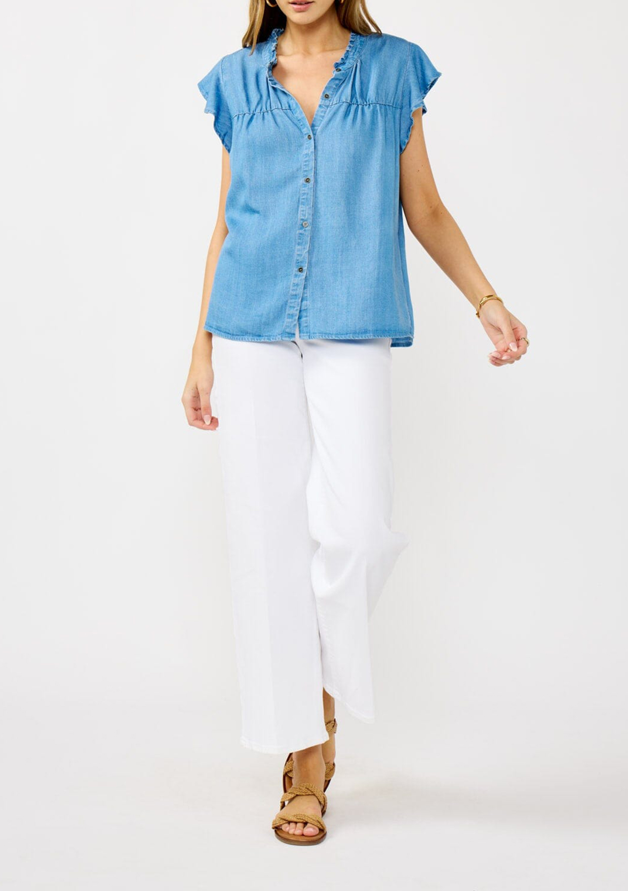 A staple for every woman's wardrobe. This classic tencel denim top features a button front, a ruffled neckline, and short flutter sleeves. Perfect for the office, or dress it down for the