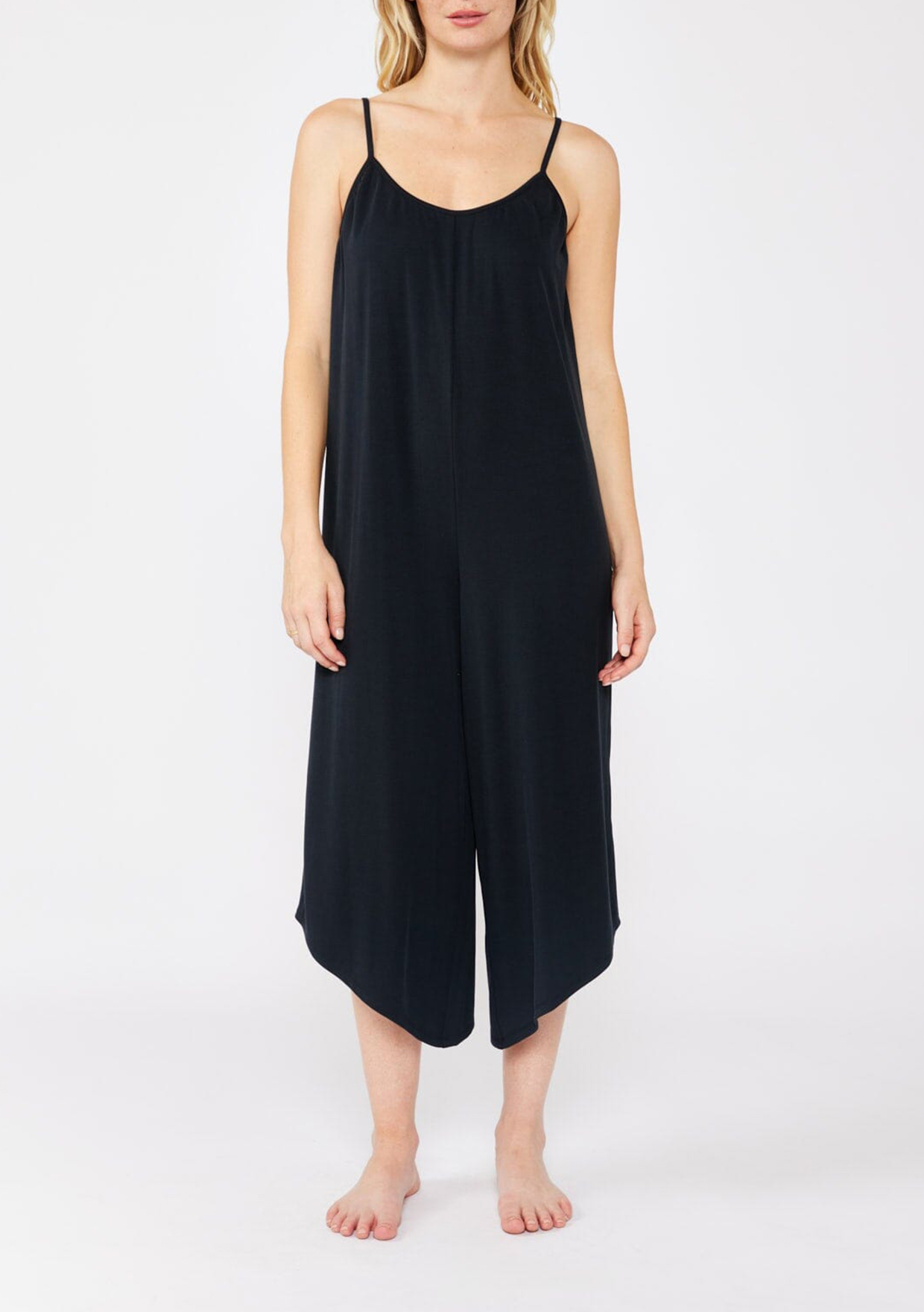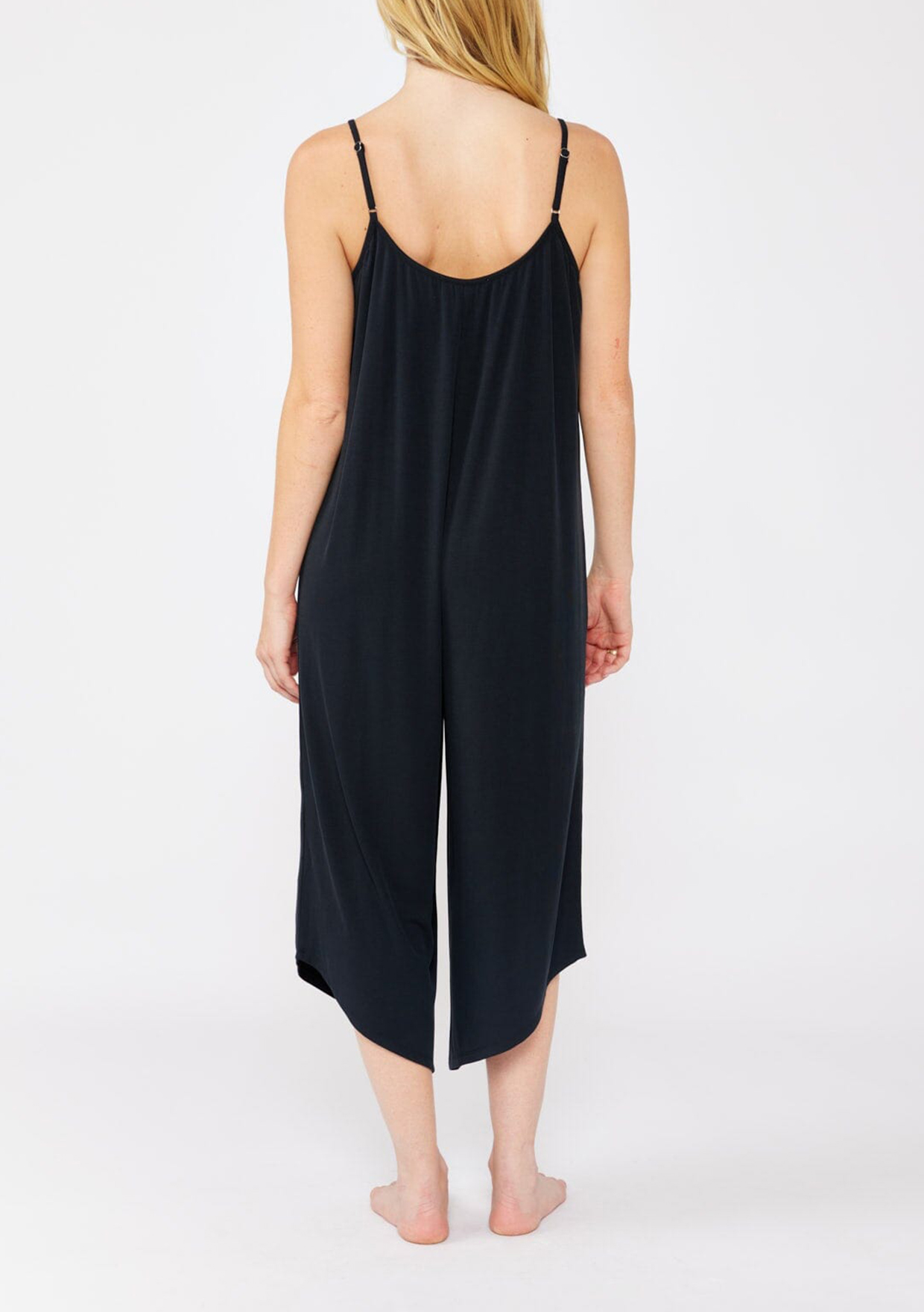 A year-round staple designed in an ultra-soft micro ribbed knit. This versatile jumpsuit features adjustable spaghetti straps, a flattering scoop neckline, and a cropped wide leg. Ideal for