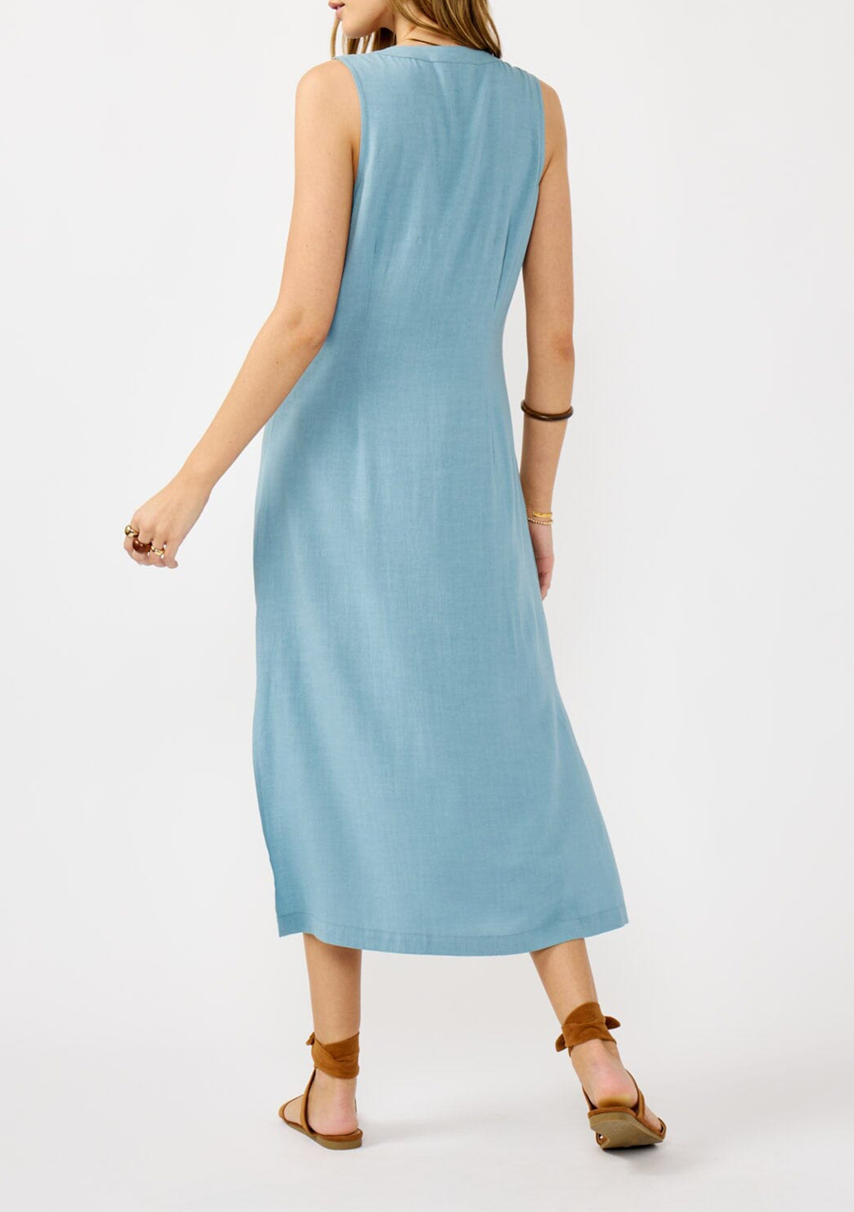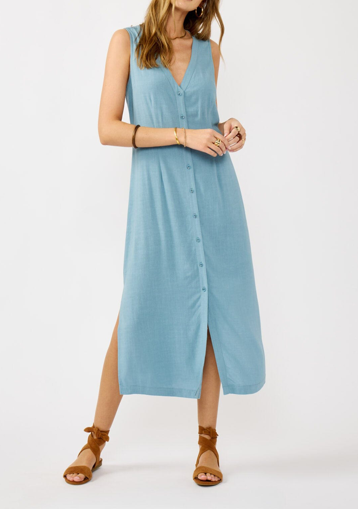 A must-have for spring, this effortlessly chic dress features a v-neckline, button-front detail, and side slits for movement. Style it with strappy sandals for a laid-back feel or elevate it