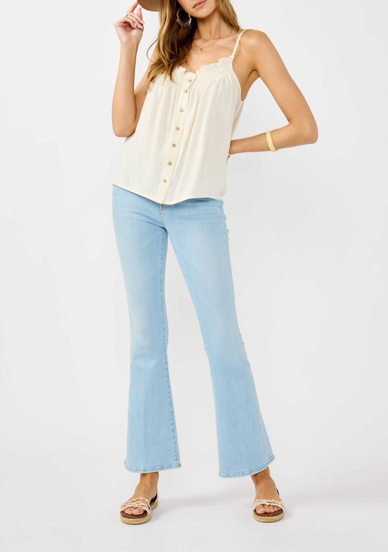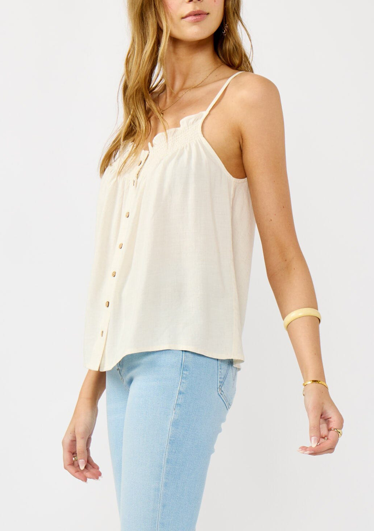 A super-flowy boho camisole that captures the essence of free-spirited style. This warm weather essential features chic smocked detailing and a button front, adding a playful twist to your