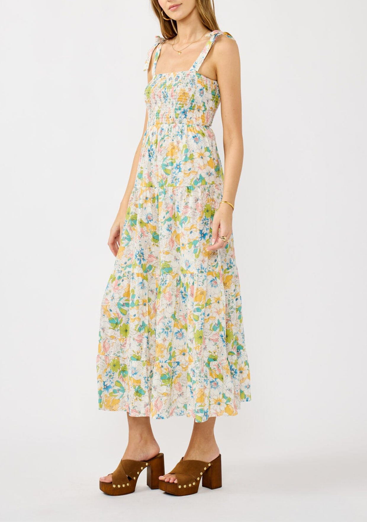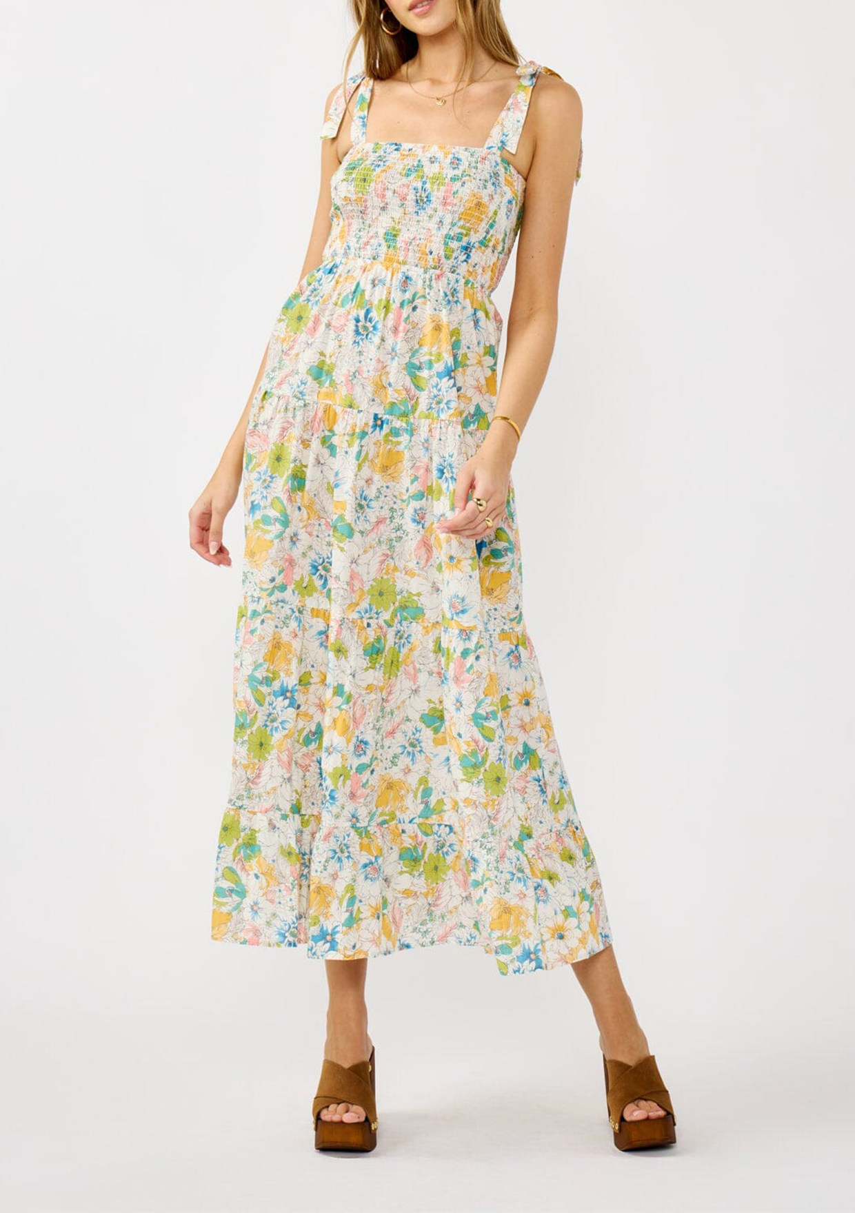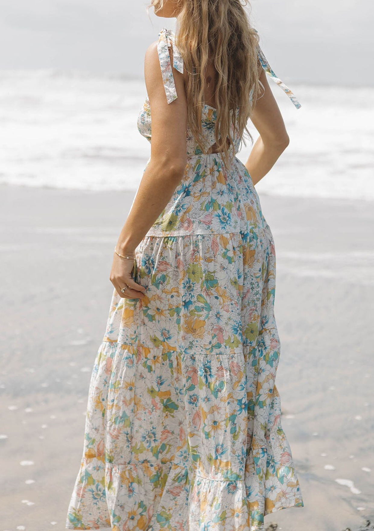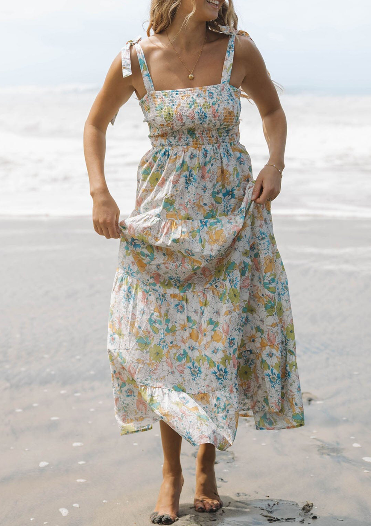 Light and breezy, this sweet maxi dress features a slim-fit smocked bodice and adjustable tie shoulders, adding a flattering and feminine touch to your summer wardrobe. Crafted from