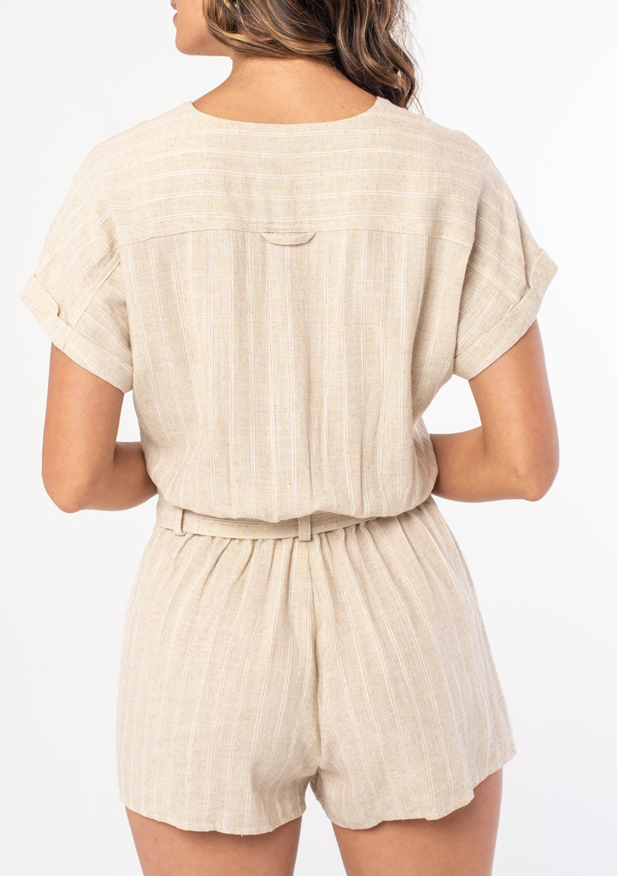 Ready to romp? Our classic short romper is designed in a soft neutral stripe. Featuring short cuffed sleeves, an adjustable tie waist belt, and essential side pockets. We love to pair this