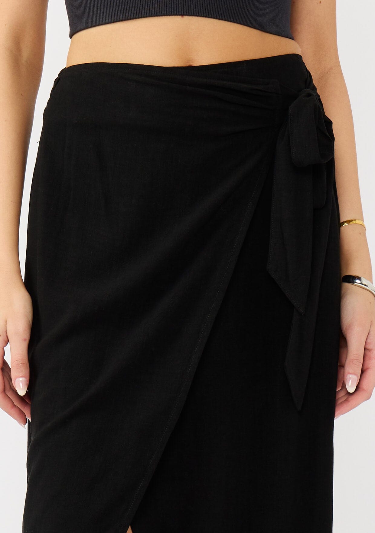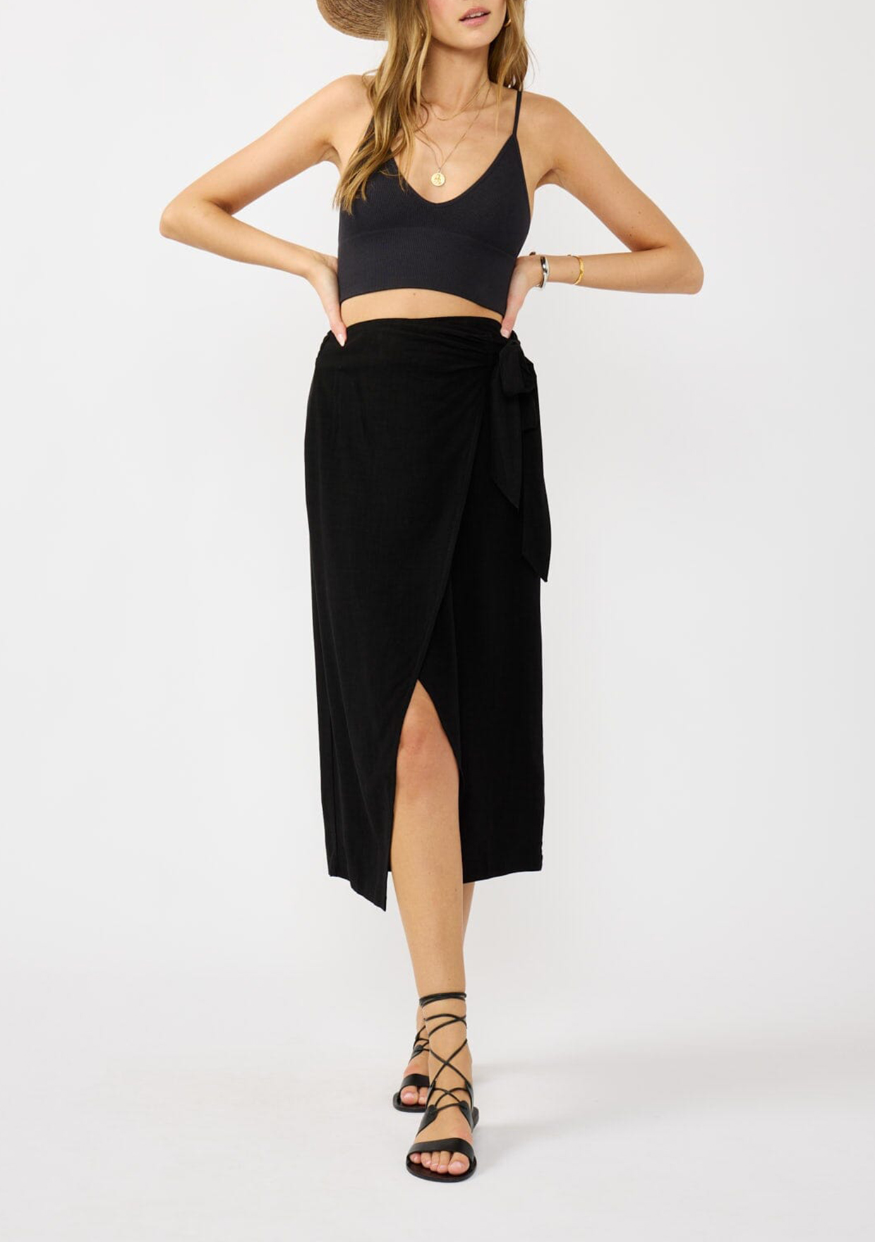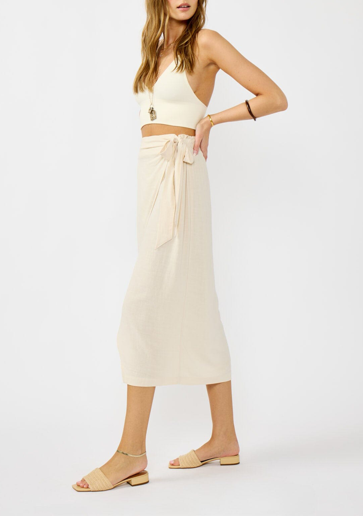 Give your denim a break and slip into this effortlessly chic wrap skirt. Designed with a sleek mid-length silhouette and a flattering side tie closure, it's the perfect blend of comfort and