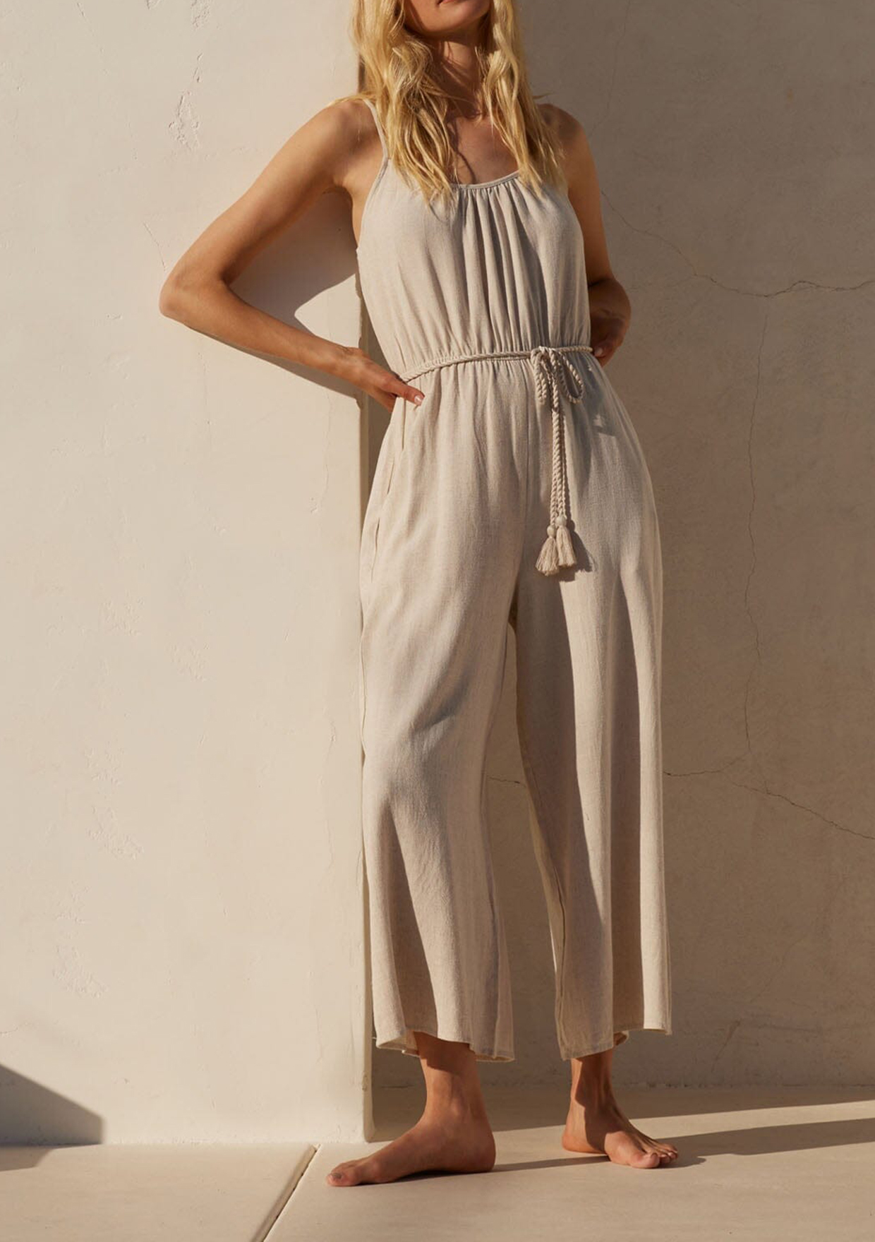 The perfect alternative to a maxi dress, our sophisticated yet comfortable jumpsuit features adjustable spaghetti straps, a scooped neckline, and essential side pockets. The braided tassel