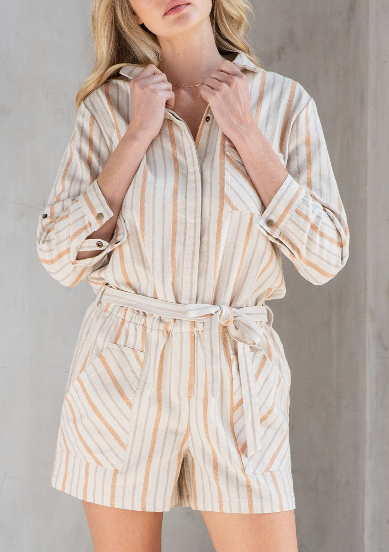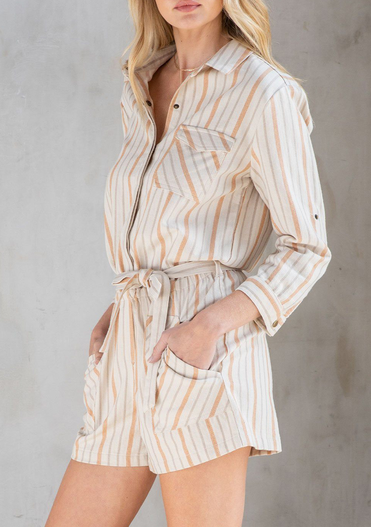 A ready-for-adventure style, our cute and casual short romper is designed in a classic yarn dye stripe. Featuring a versatile long rolled sleeve with button tab closure, an adjustable waist tie belt, and essential side pockets. We love to pair this effortless style with tennis shoes or dressed up with a colorful strappy sandal.