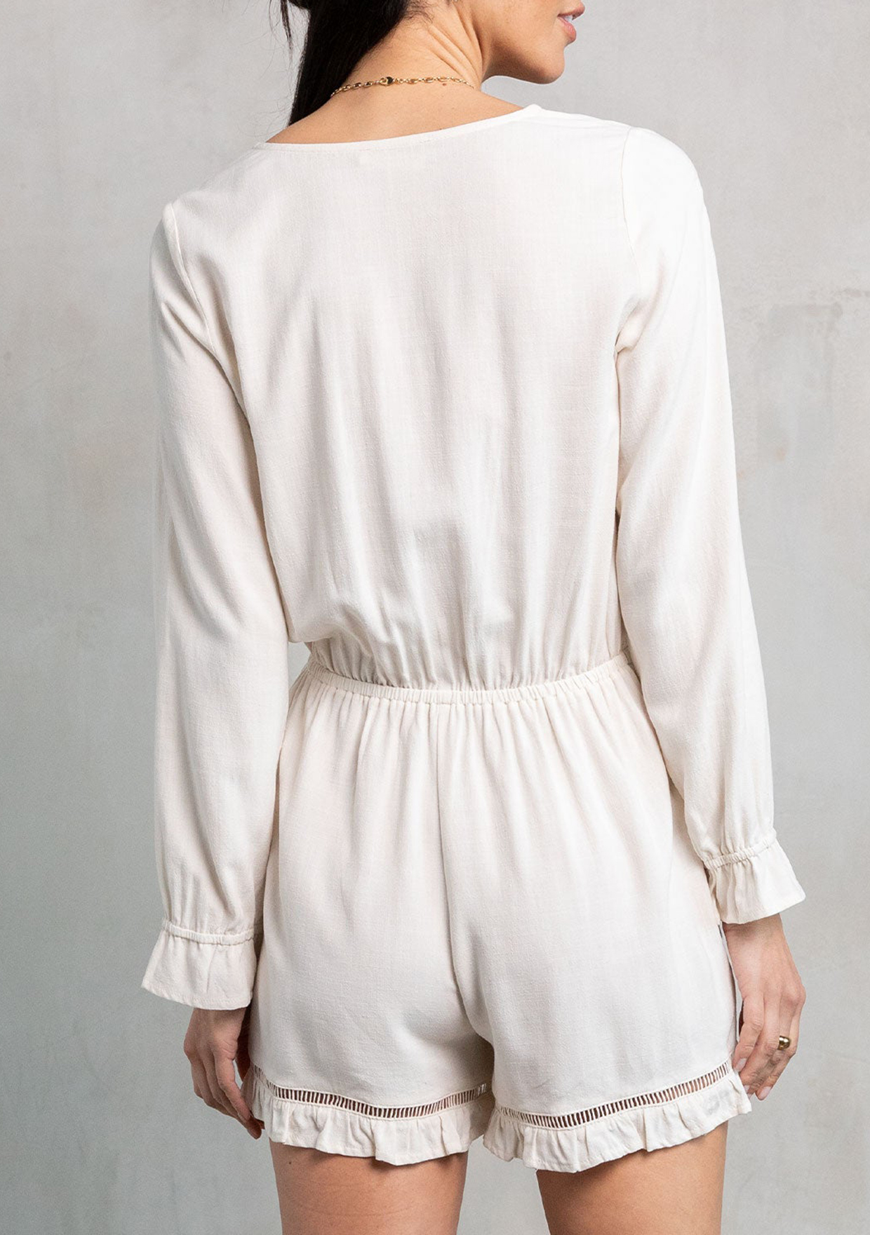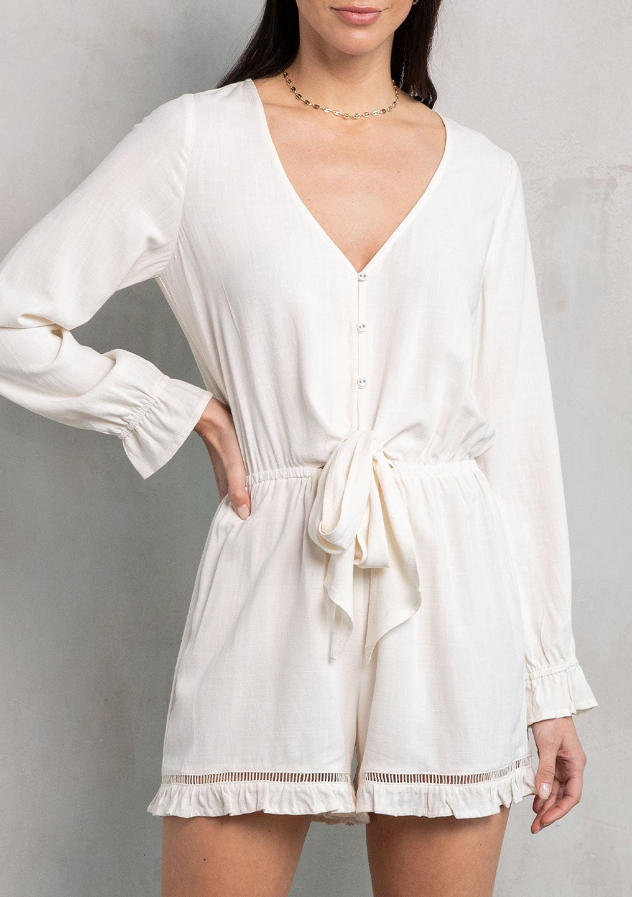 An ultra-charming short romper made from a cool linen blend. Featuring a long sleeve with a ruffled wrist cuff, ruffle-trimmed shorts, and an adjustable tie front waist. Perfect for Spring, we love to style this romper with a simple sandal.